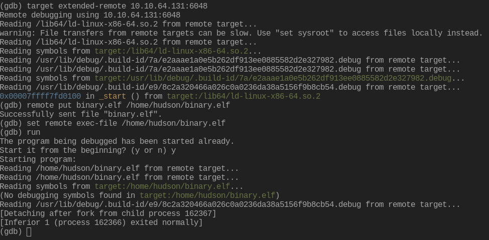 We found a gdb server running on port 6048, our mystery port. Doing some research over on hacktricks, it looks like you can execute binaries remotely on a gdb server pretty easily. Let’s try that out.